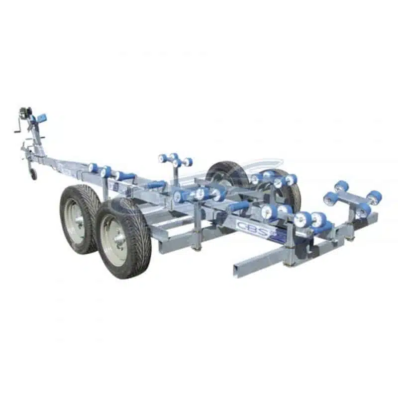 La remorque de Mise à l’eau CBS Remorques CM6 a un châssis équipé de bobines avec des galets latéraux pour la stabilité du bateau pendant le trajet.