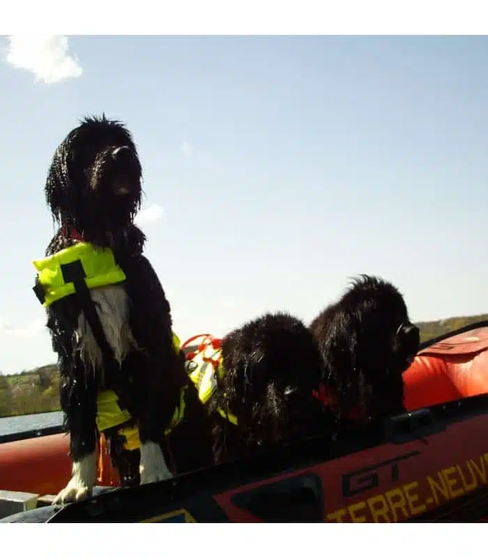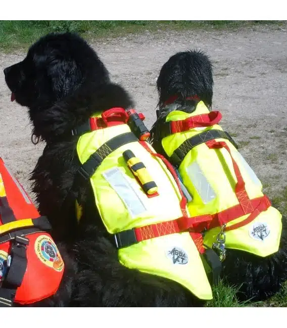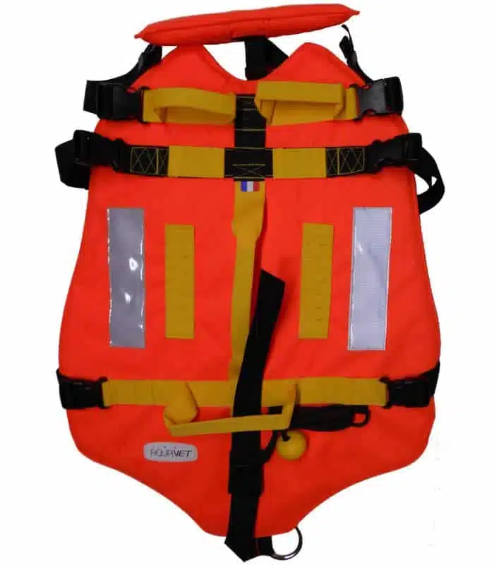 Gilet-harnais flottant pour chiens, destiné aux professionnels de la sécurité et aux équipes d’intervention en sauvetage aquatique.