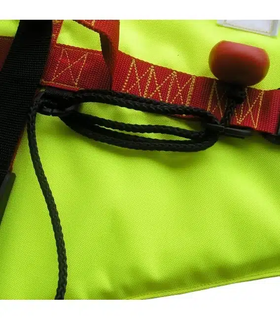 Passages sous-poitrail et cou moussés, fermetures et serrages par sangles et boucles à attache rapide, anneau arrière de tirage en acier, fixé sur sangle avec boucle à largage rapide et bout 1 mètre. 4 poignées de tenue, un support de flash-light, un porte couteau, un support de lampe torche, bandes rétro-réfléchissantes. La flottabilité assurée par de la mousse Biosoft.