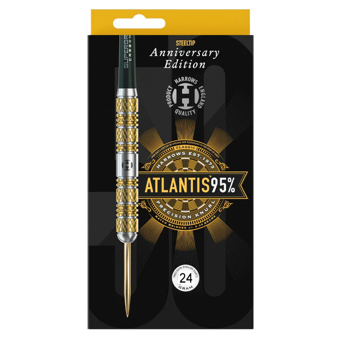 - Pour fêter ses 50ans, Harrows a resorti des jeux emblématiques, dont les fléchettes Atlantis qui ont marqué une autre étape notable de leur histoire, car elles étaient les premières fléchettes à 95 % de tungstène jamais commercialisées par Harrows.