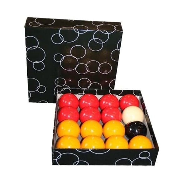 Jeu de billes standard avec billes jaunes et rouges pour jouer au billard anglais sur un billard américain.