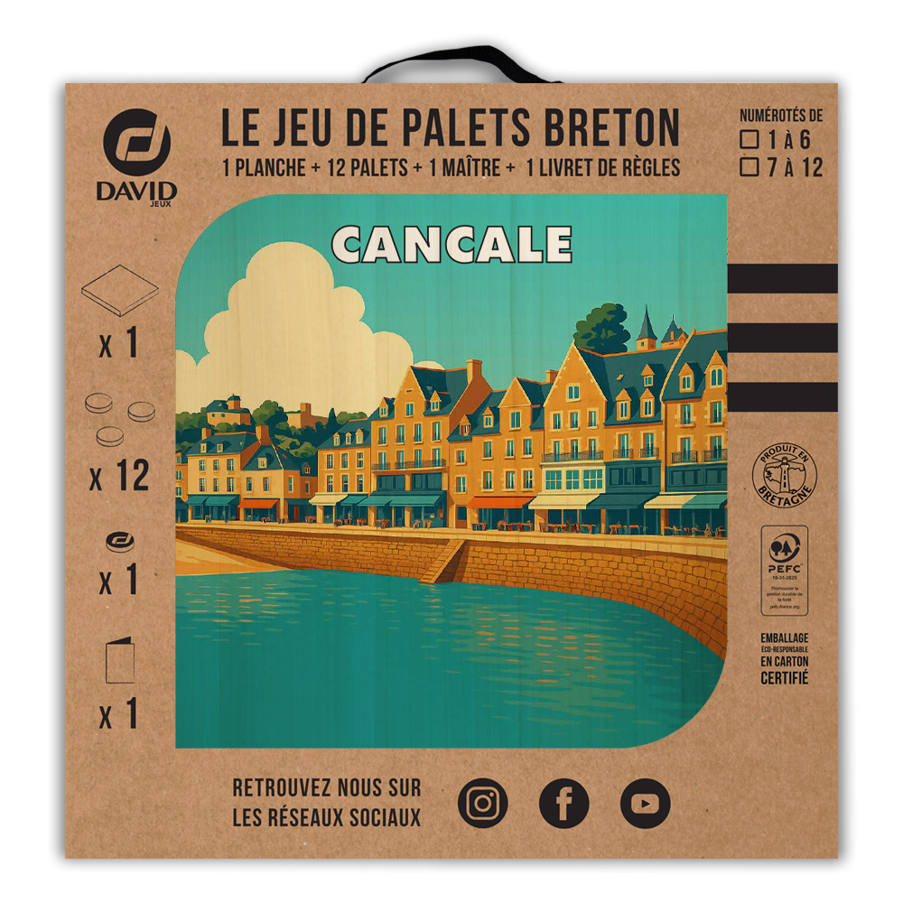 Une planche, 12 palets DAVID (de notre gamme l’Amical Breton), un maître, une règle du jeu et le tour est joué ! Vous voilà équipé pour jouer seul ou en équipe au jeu de palet. Par n’importe quel temps, en intérieur ou en extérieur, sortez votre planche et partagez une activité conviviale en famille ou entre amis. Cette sérigraphie originale est apposée sur une planche en peuplier.   Découvrez les règles du palet breton en vidéo : Les règles du palet breton