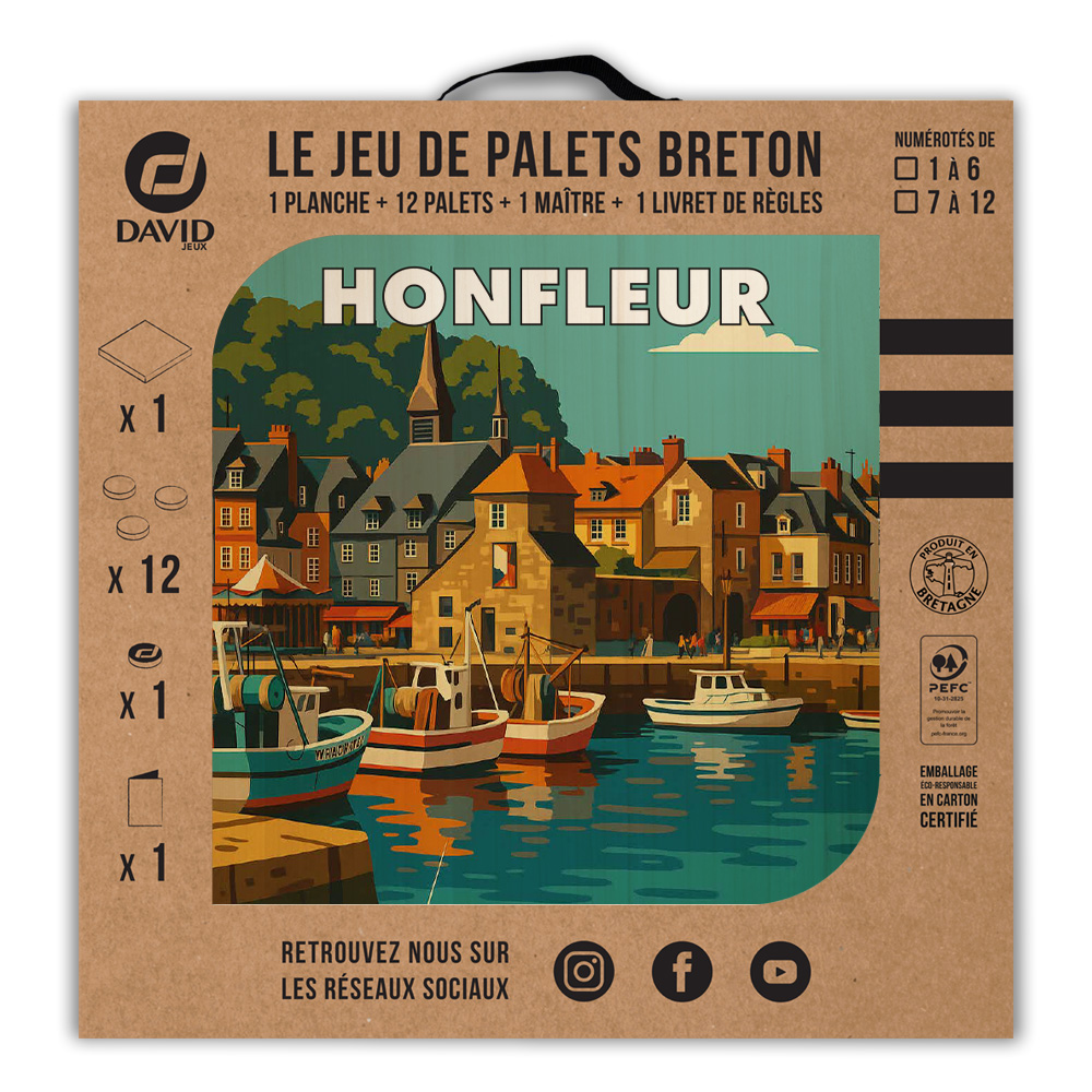 Une planche, 12 palets DAVID (de notre gamme l’Amical Breton), un maître, une règle du jeu et le tour est joué ! Vous voilà équipé pour jouer seul ou en équipe au jeu de palet. Par n’importe quel temps, en intérieur ou en extérieur, sortez votre planche et partagez une activité conviviale en famille ou entre amis. Cette sérigraphie originale est apposée sur une planche en peuplier.   Découvrez les règles du palet breton en vidéo : Les règles du palet breton