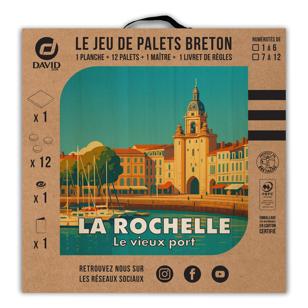Une planche, 12 palets DAVID (de notre gamme l’Amical Breton), un maître, une règle du jeu et le tour est joué ! Vous voilà équipé pour jouer seul ou en équipe au jeu de palet. Par n’importe quel temps, en intérieur ou en extérieur, sortez votre planche et partagez une activité conviviale en famille ou entre amis. Cette sérigraphie originale est apposée sur une planche en peuplier.   Découvrez les règles du palet breton en vidéo : Les règles du palet breton