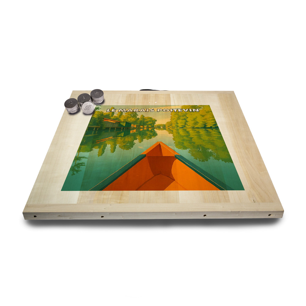 Une planche, 12 palets DAVID (de notre gamme l’Amical Breton), un maître, une règle du jeu et le tour est joué ! Vous voilà équipé pour jouer seul ou en équipe au jeu de palet. Par n’importe quel temps, en intérieur ou en extérieur, sortez votre planche et partagez une activité conviviale en famille ou entre amis. Cette sérigraphie originale est apposée sur une planche en peuplier.   Découvrez les règles du palet breton en vidéo : Les règles du palet breton