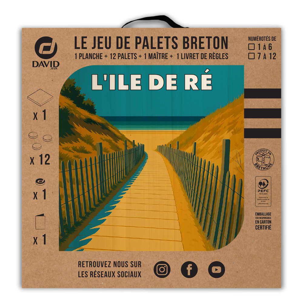 Une planche, 12 palets DAVID (de notre gamme l’Amical Breton), un maître, une règle du jeu et le tour est joué ! Vous voilà équipé pour jouer seul ou en équipe au jeu de palet. Par n’importe quel temps, en intérieur ou en extérieur, sortez votre planche et partagez une activité conviviale en famille ou entre amis. Cette sérigraphie originale est apposée sur une planche en peuplier.   Découvrez les règles du palet breton en vidéo : Les règles du palet breton