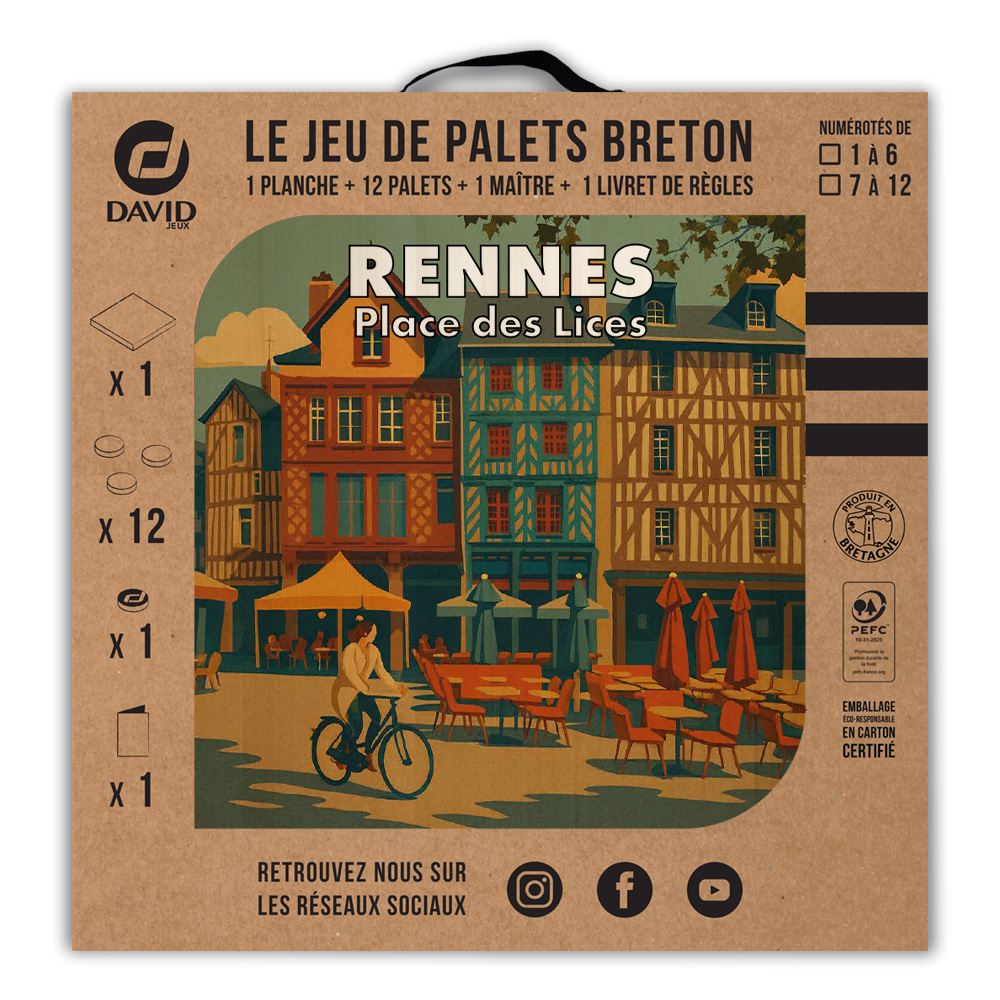 Une planche, 12 palets DAVID (de notre gamme l’Amical Breton), un maître, une règle du jeu et le tour est joué ! Vous voilà équipé pour jouer seul ou en équipe au jeu de palet. Par n’importe quel temps, en intérieur ou en extérieur, sortez votre planche et partagez une activité conviviale en famille ou entre amis. Cette sérigraphie originale est apposée sur une planche en peuplier.   Découvrez les règles du palet breton en vidéo : Les règles du palet breton