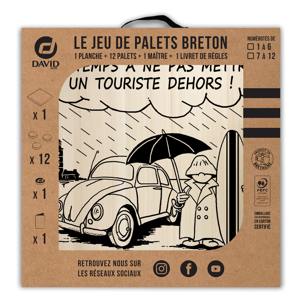 Une planche, 12 palets DAVID (de notre gamme l’Amical Breton), un maître, une règle du jeu et le tour est joué ! Vous voilà équipé pour jouer seul ou en équipe au jeu de palet. Par n’importe quel temps, en intérieur ou en extérieur, sortez votre planche et partagez une activité conviviale en famille ou entre amis.