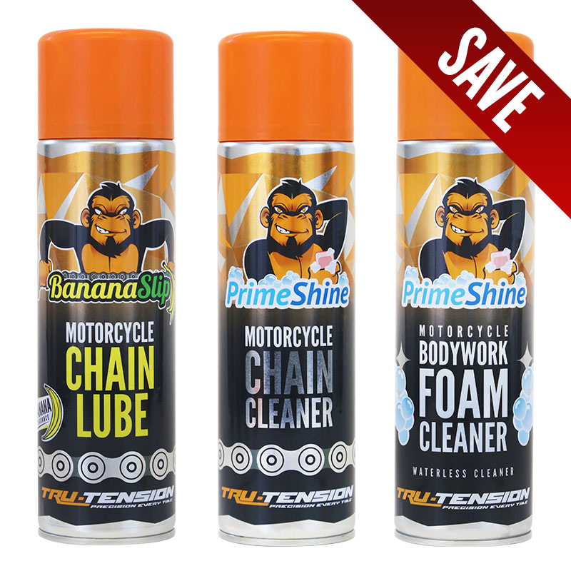 Pour finir, protégez votre chaîne et vos pignons avec un lubrifiant parfaitement formulé et adapté à vos besoins en matière de conduite. Choisissez un lubrifiant de la gamme BananaSlip, le lubrifiant ou la cire de chaîne moto, en fonction de la surface et votre style de conduite. Tous deux pénètrent en profondeur dans les maillons de la chaîne pour une protection et une performance durables, et ils sentent bon la banane.