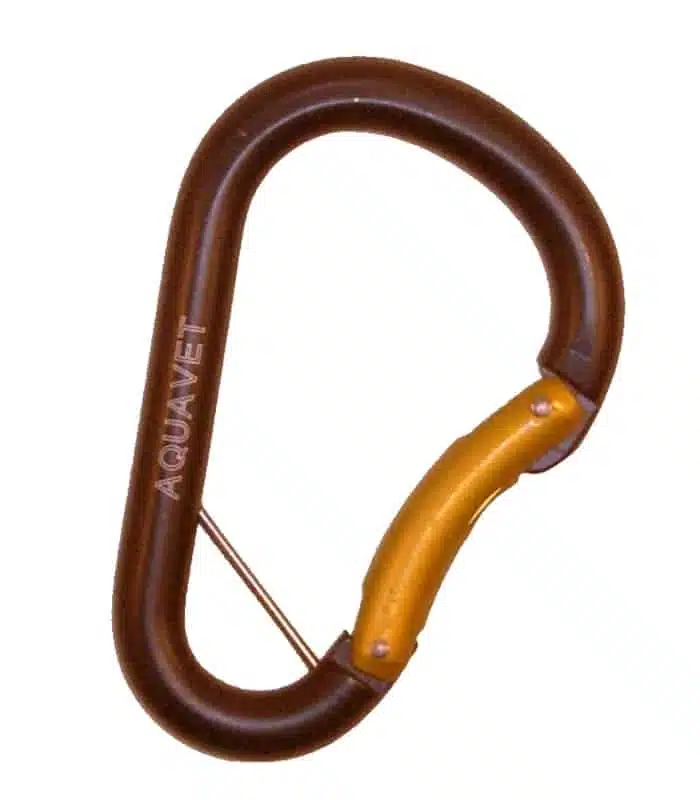 Mousqueton AQUAVET à grande ouverture (32mm.) permettant le passage d’un tube de pagaie, et muni d’une barrette de blocage.