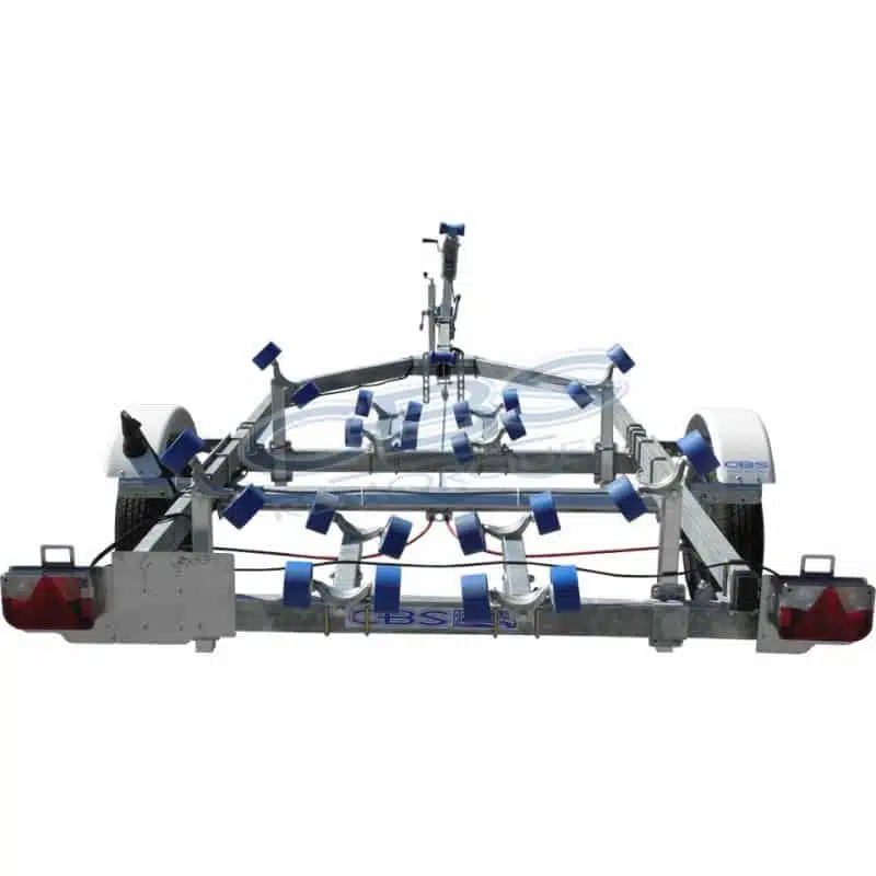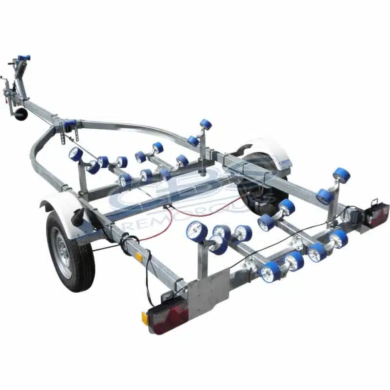 La Remorque pour Bateau CBS M0640F a un châssis cintré équipé de multiples galets pour un centrage et une bonne stabilité, de supports essieu réglables. Elle possède également une potence avec un treuil à sangle et une roue jockey ainsi que divers accessoires.