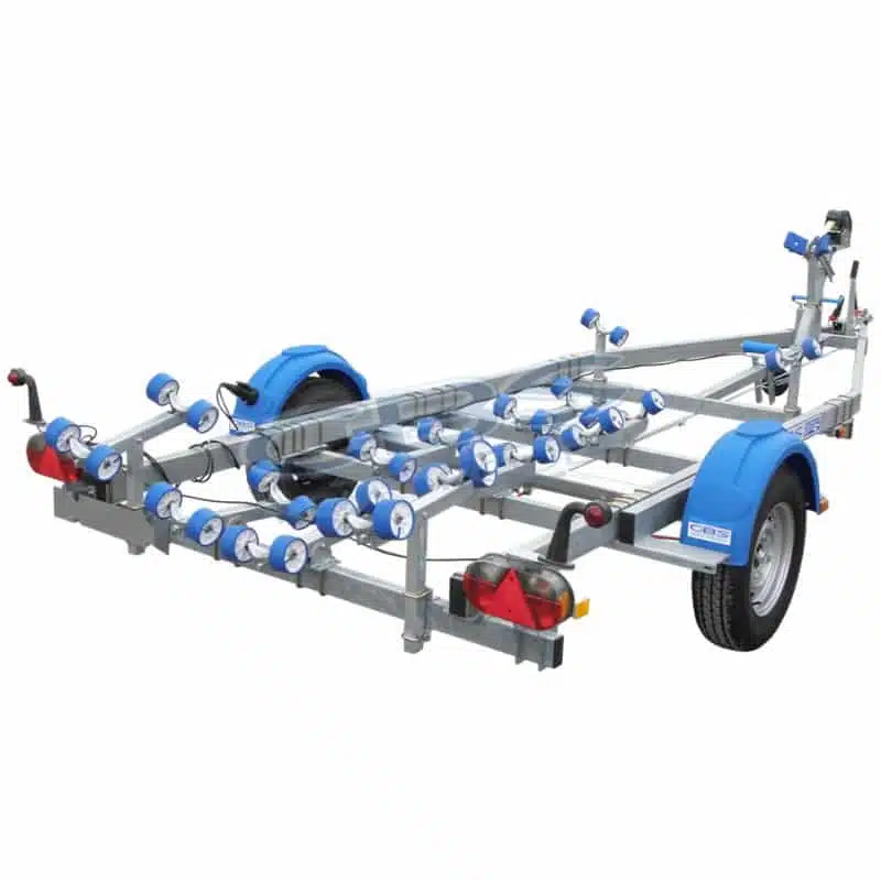 La Remorque pour Bateau CBS M1060F a un châssis cintré équipé de multiples galets pour un centrage et une bonne stabilité, de supports essieu réglables. Elle possède également une potence avec un treuil à sangle et une roue jockey ainsi que divers accessoires.