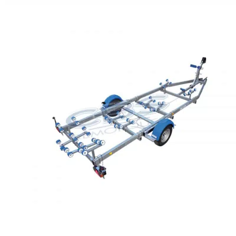 La Remorque pour Bateau CBS M1400F a un châssis cintré équipé de multiples galets pour un centrage et une bonne stabilité, de supports essieu réglables. Elle possède également une potence avec un treuil à sangle et une roue jockey ainsi que divers accessoires.