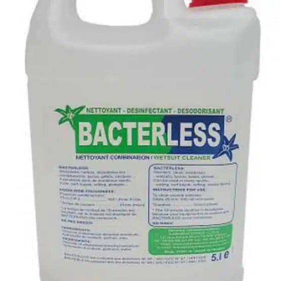 DESCRIPTIF Du Produit : Le BACTERLESS désinfecte, désodorise et nettoie les lycras, gilets, casque et combinaisons. Produits respectant l’environnement, il est biodégradable. Existe en 5 et 1 Litre Caracteristiques techniques : Le conditionnement en bidon de 5 litres, vous permettra de désinfecter une grande quantité de vêtements. La composition du bacterless est la suivante :chlorure d’alkybenzyl-dimethyl-amonium, hydroxyde de sodium, parfum et eau. Le bacterless est conforme aux directives: N° 88 / 379 / CEE N° 67 / 548 / CEE UTILISATION préconisée : Pour plusieurs combinaisons : 25.cl (1/4L) pour 100 litres d’eau froide. Pour une combinaison : 25 .ml pour 10 litres d’eau froide. Le temps de contact idéal est de 10 minutes, il faut savoir que le matériel est imprégné de bacterless dès l’immersion. important : Il est inutile de rincer le matériel après le nettoyage avec bacterless.