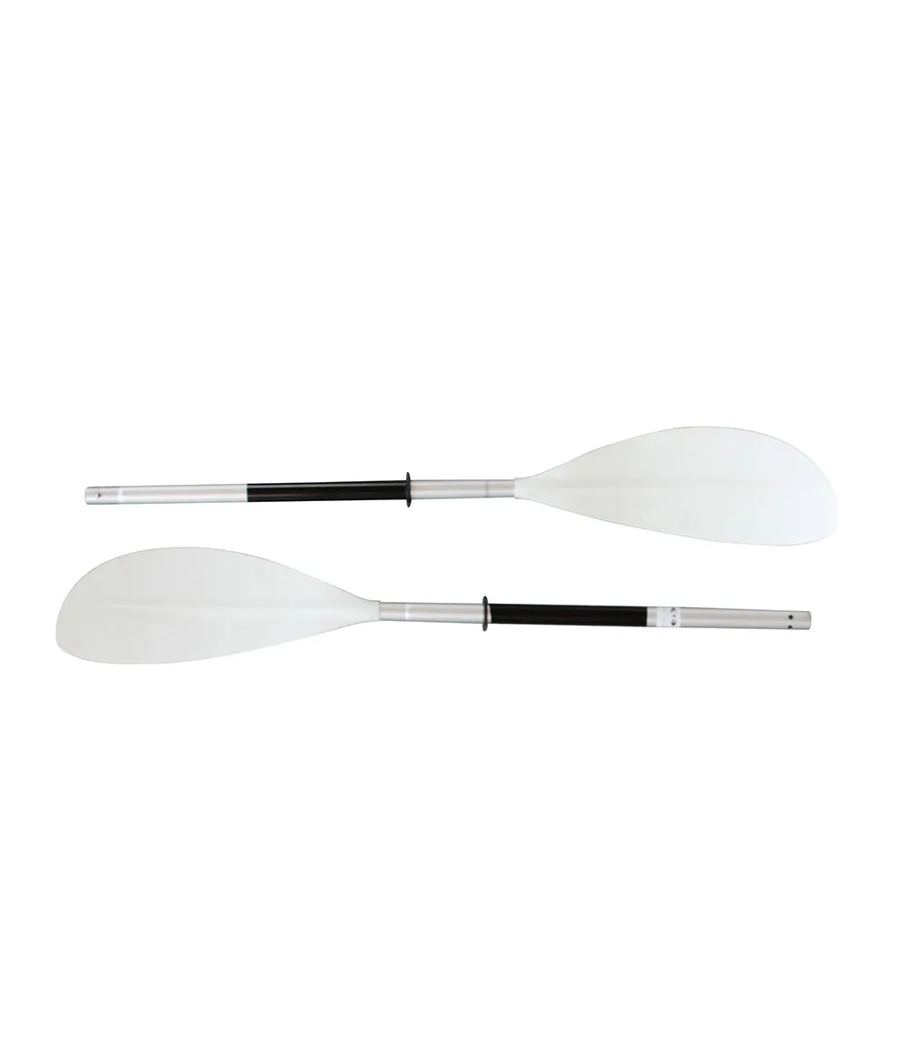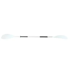 Pagaie 2 parties, pales blanches asymétriques en fibrylon, manche alu 30 mm gainé, anneaux pare-gouttes.