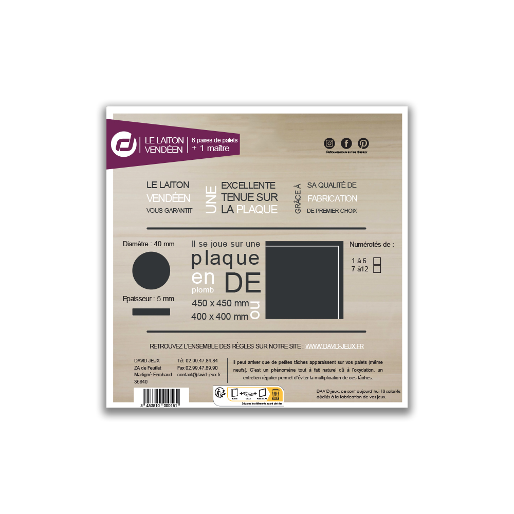 Ce jeu de palets vendéen en laiton est idéal pour les joueurs, qu’ils soient débutants ou expérimentés, souhaitant s’entraîner ou participer à des compétitions. Grâce à sa conception en laiton, il garantit une grande précision et une durabilité optimale.