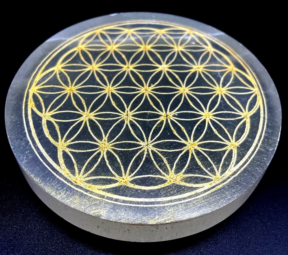 Plaque de rechargement en pierre Sélénite avec fleur de vie dorée
