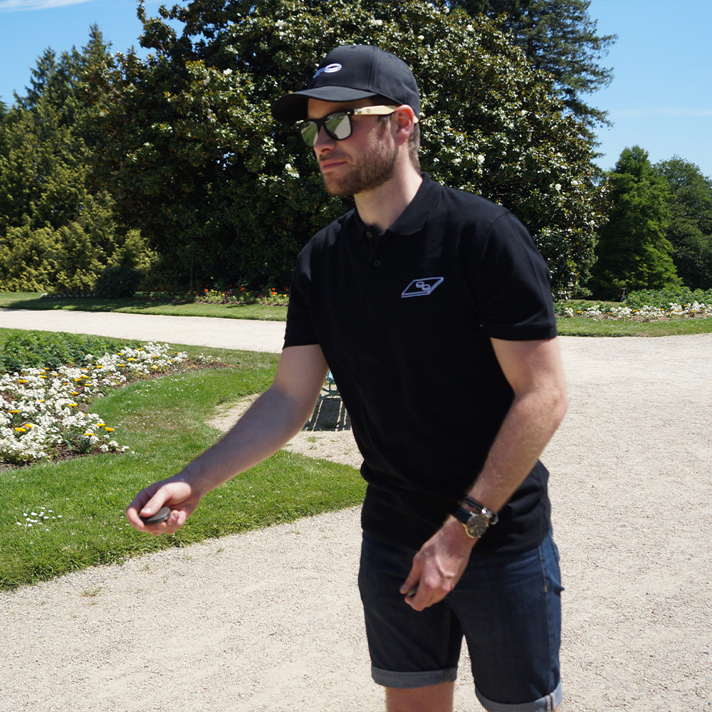 Découvrez notre polo pour homme noir 80% en coton biologique. Polo avec broderie côté cœur planche & palets breton.