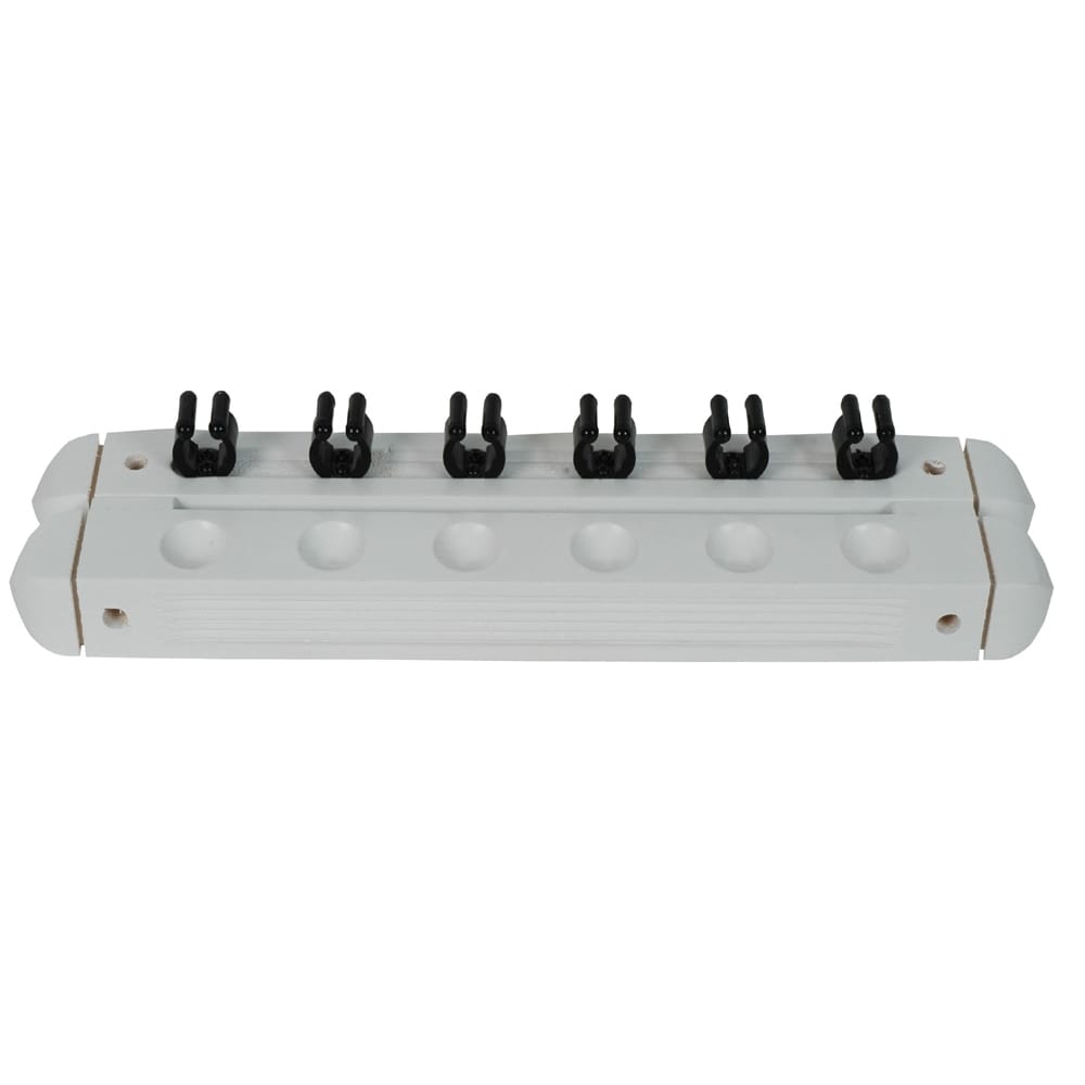 Ce porte-queues de billard en bois coloris blanc est en deux parties. Il se fixe très simplement au mur avec la visserie fournie et permet de ranger 6 queues de billard, tous modèles confondus.