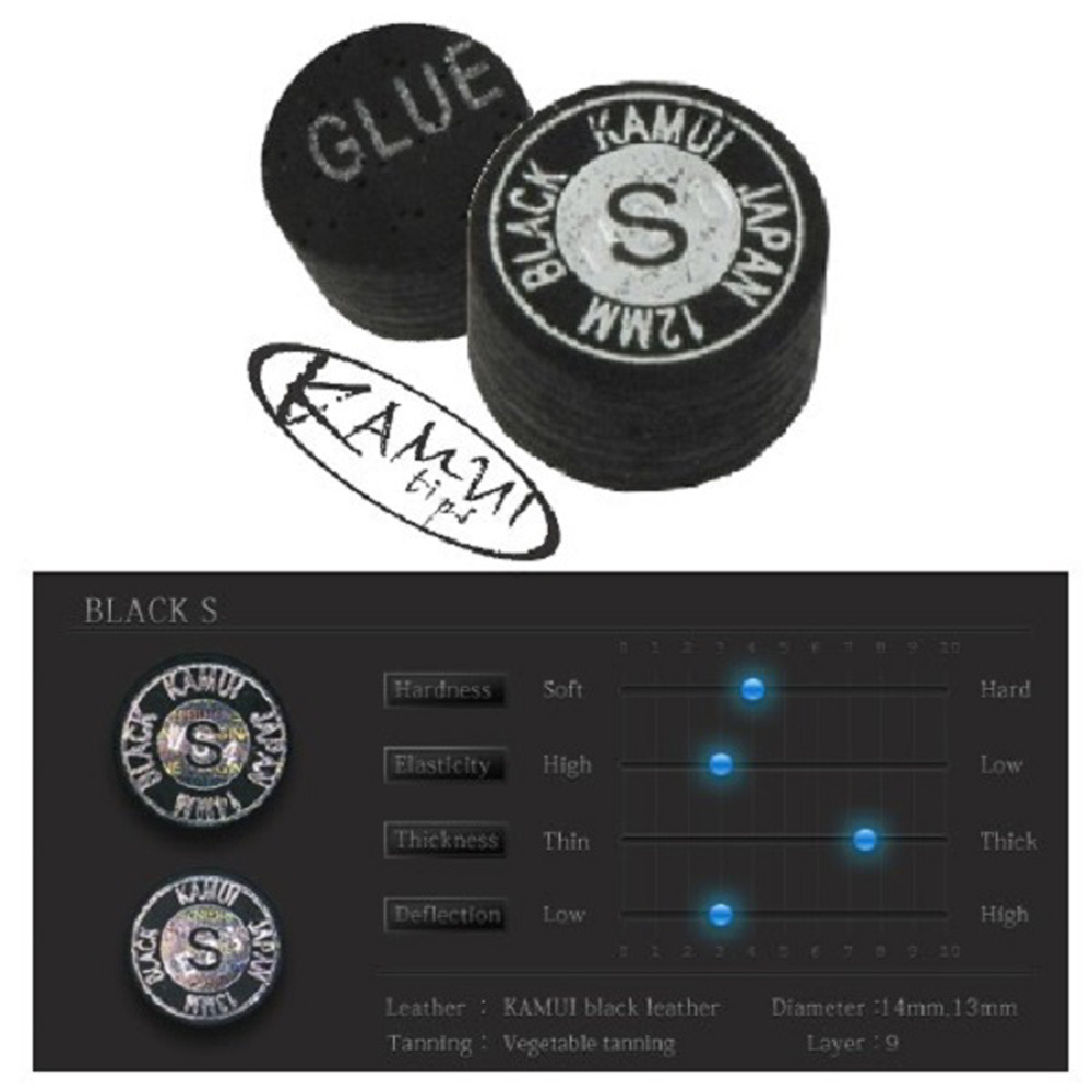 • Le nouveau procédé KAMUI Black est conçu pour donner plus d’effet à la bille blanche. En plus des avantages du procédé KAMUI Original, le joueur peut mettre plus d’effet avec une vitesse plus lente. L’élasticité du cuir noir absorbe l’énergie de la queue de billard afin de donner l’effet désiré à la bille blanche.