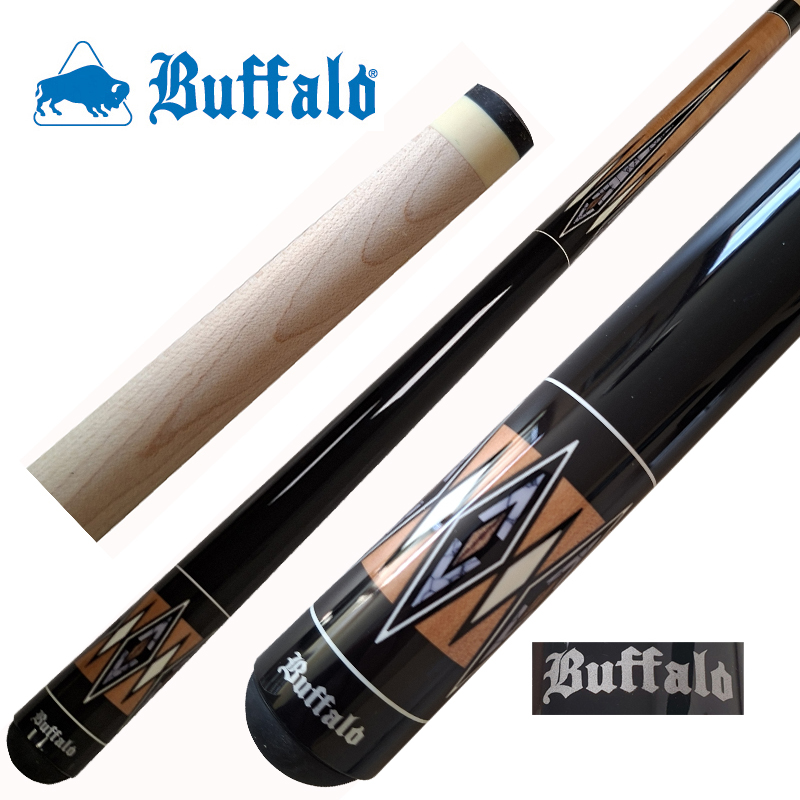 - Le fût de la queue Tokara 2 Buffalo est en érable teinté couleur café et présente une impression UV de formes triangulaires ornées de pierres blanc cassé, noires, bocote et blanches au-dessus et en dessous du grip peint en noir