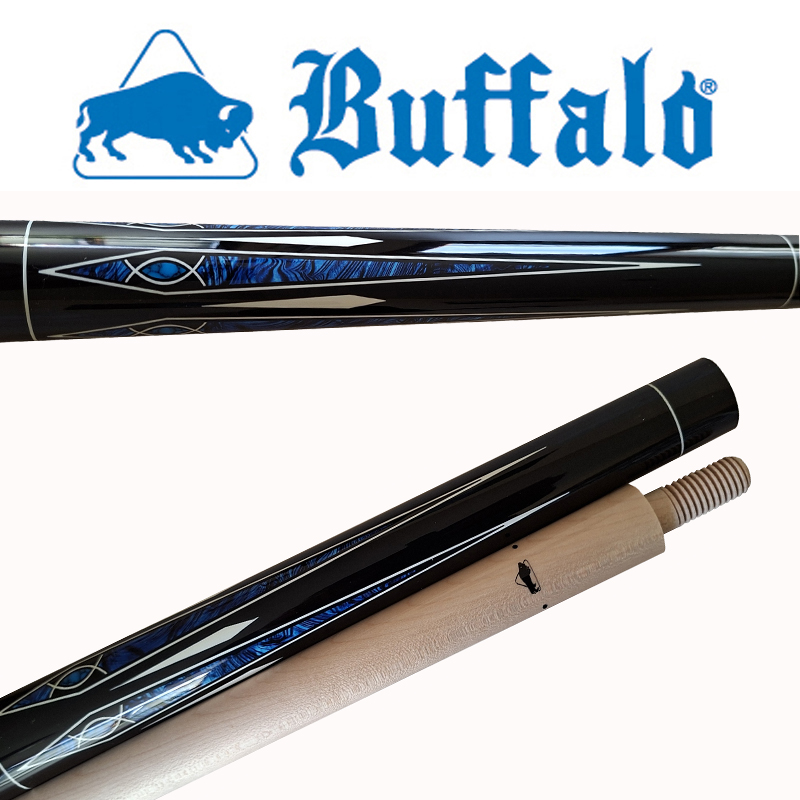 - Le fût de la queue de billard Tokara 3 Buffalo est en érable teinté noir et présente un élégant motif imprimé UV au-dessus et en dessous du grip, décliné en blanc cassé, noir, bleu poly et pierres bleues