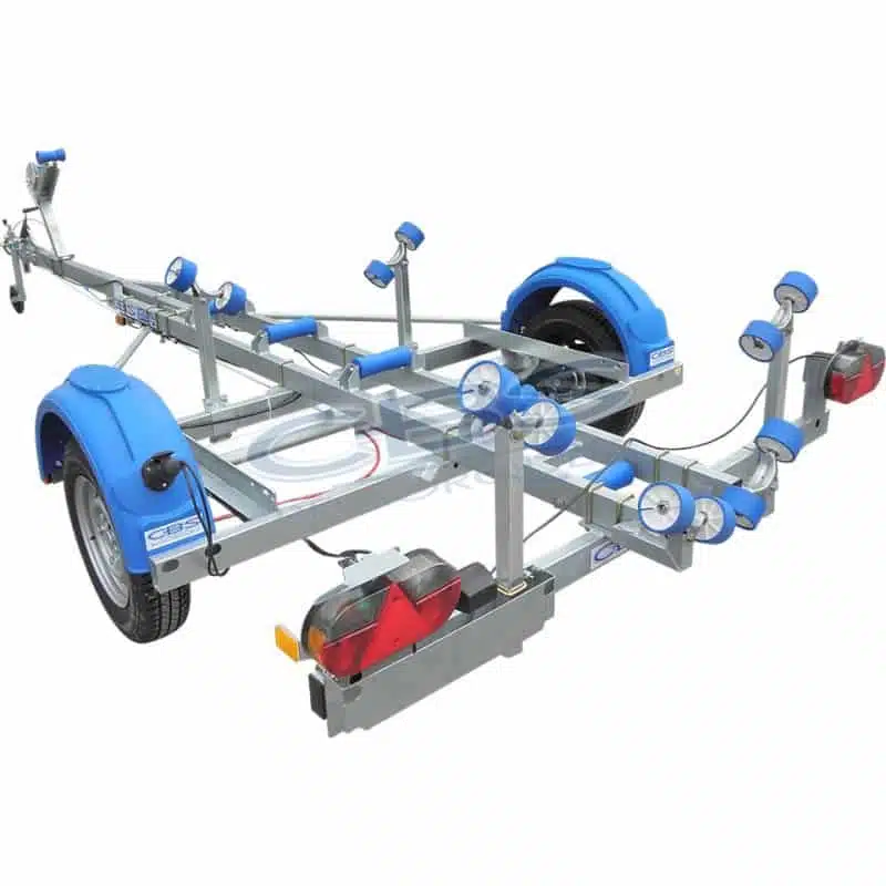 Notre remorque bateau CBS T6F simple essieu freinée avec timon basculant, servira au transport de vos embarcations semi-rigide. La CBS Remorques bateau T6F a un châssis équipé de bobines avec des galets latéraux assurant la stabilité, un cadre réglable, ainsi qu’une potence avec un treuil à sangle, essieu remorque Alko et une roue jockey.