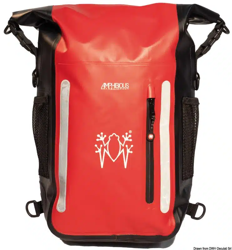 Fermeture quick proof, dos rembourré avec tissu réticulaire respirant, support lombaire amovible, bandes rétro réfléchissants, poches avec fermetures éclair imperméables, poches en maille filet.