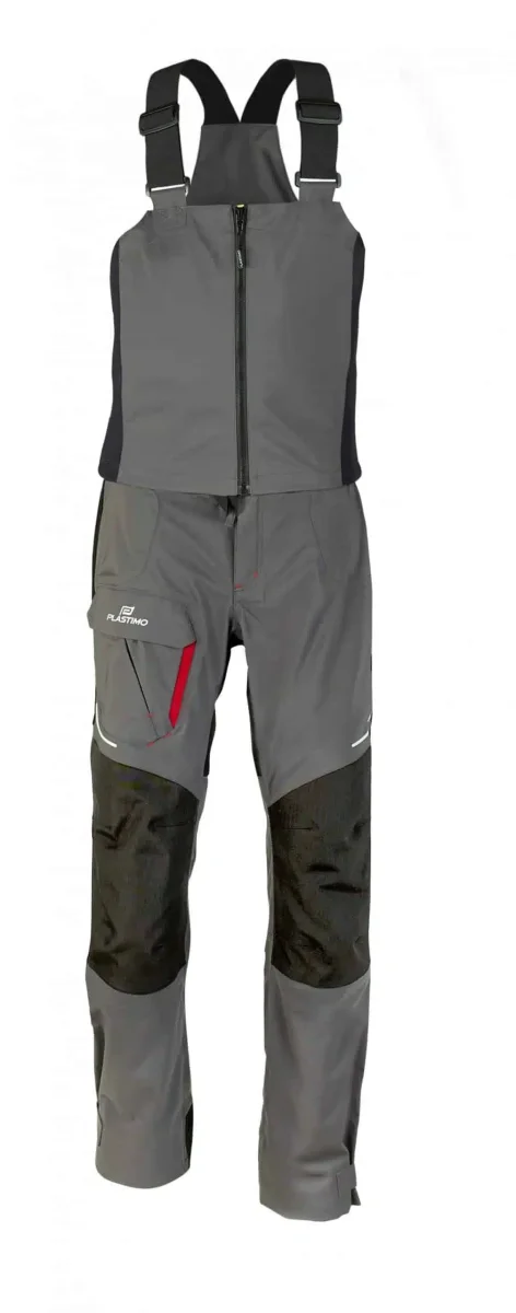 La salopette est constituée de deux éléments dissociables grâce à un zip dans le dos : un pantalon et un plastron bi-matière stretch. Avec le plastron, le buste se trouve parfaitement enveloppé, au chaud et au sec. L’ensemble modulaire permet d’adapter rapidement sa tenue aux conditions de navigation.